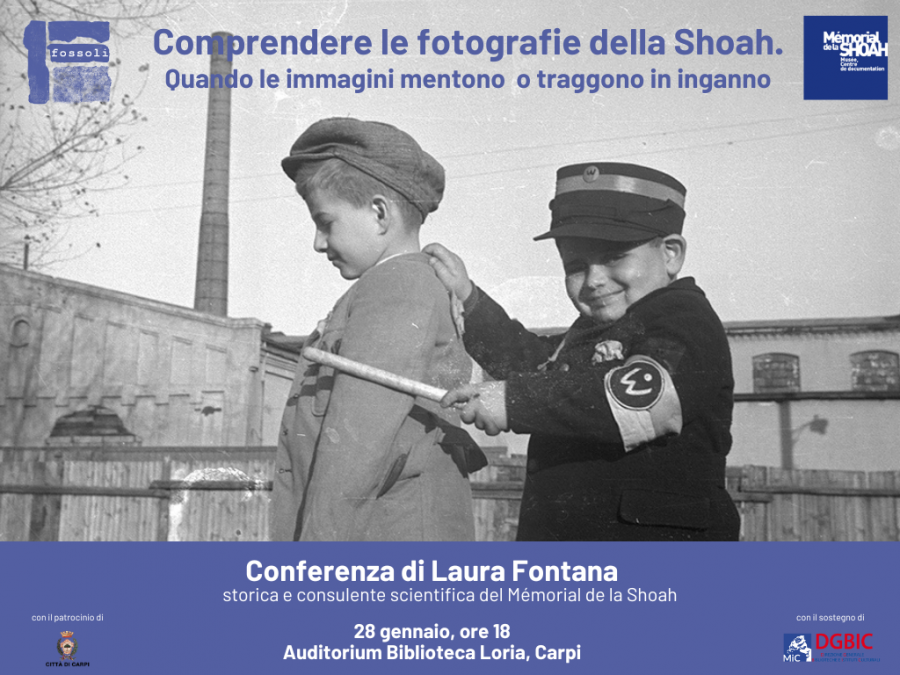 In occasione del Giorno della Memoria, il 28 gennaio 2026 alle ore 18 la Fondazione Fossoli e il Mémorial della Shoah con il patrocinio del Comune di Carpi propongono, presso l'auditorium della Biblioteca Loria di Carpi, la conferenza di Laura Fontana "Comprendere le fotografie della Shoah. Quando le immagini mentono o traggono in inganno".