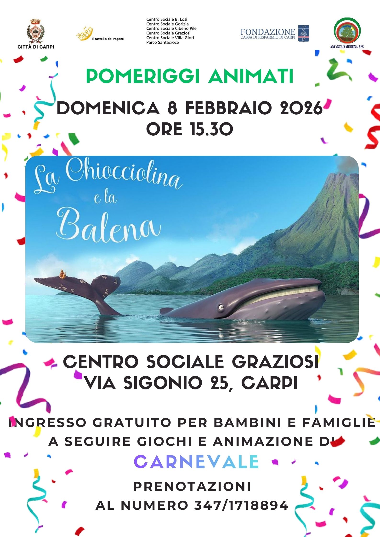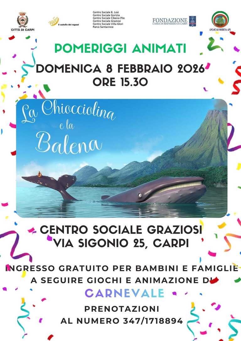 Allegati Pomeriggi animati 2026 (formato pdf - 2109.8KB) Contatti Telefono: 3471718894 Adatto a Bambini/famiglieTipo di evento Proiezione cinematograficaUlteriori informazioniCentro Sociale G. GraziosiVia C. Sigonio 25 - CarpiTel. 059.690065Ultimo aggiornamento: 26 Gennaio 2026, 13:18