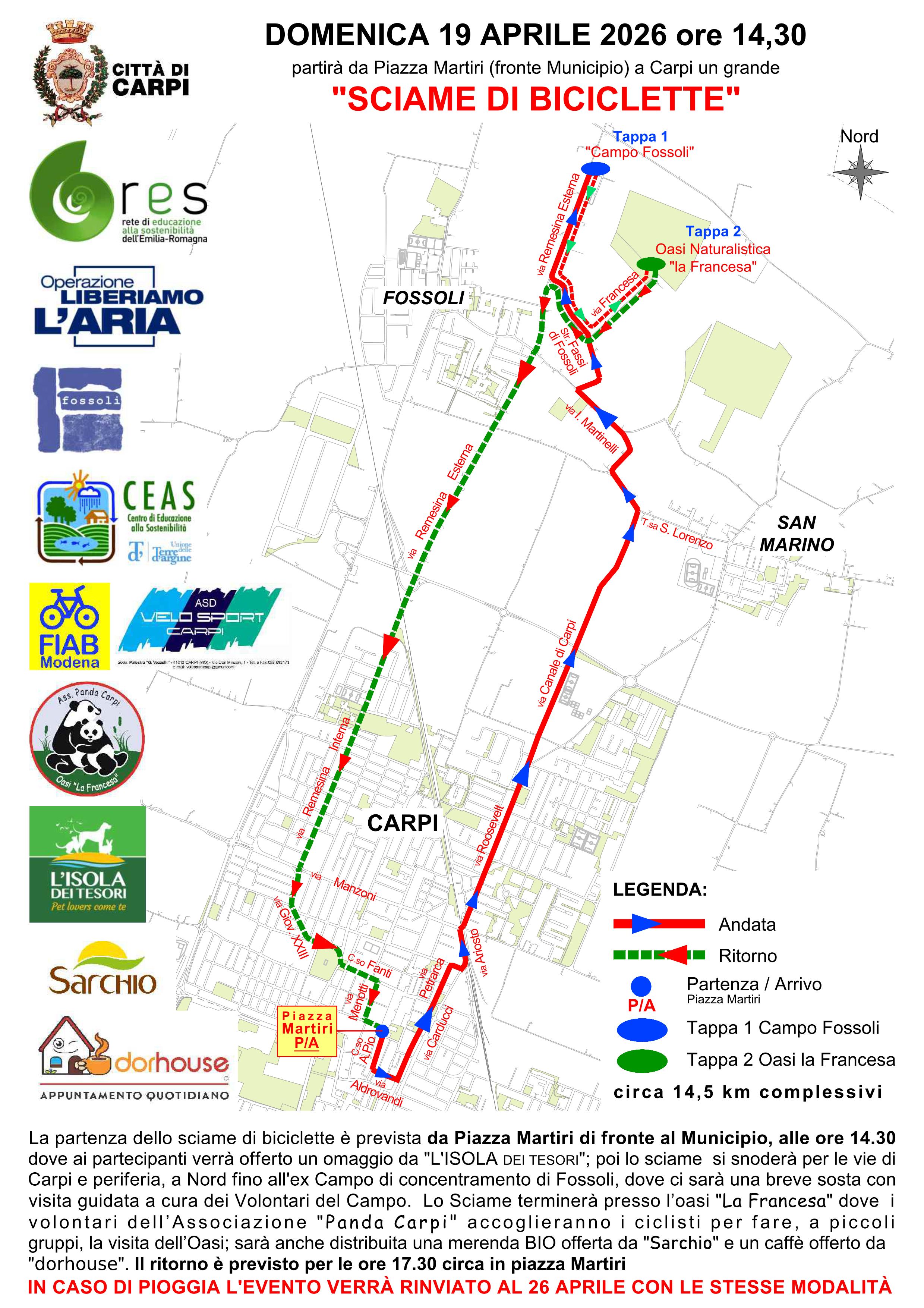 La partenza è prevista da Piazza Martiri di fronte al Municipio, alle ore 14.30 lo sciame si snodera per le vie di Carpi e periferia, a Nord fino all'ex Campo di concentramento di Fossoli, dove ci sara una breve sosta con visita guidata a cura dei Volontari del Campo. Lo Sciame terminera presso l’oasi "La Francesa" dove i volontari dell’Associazione "Panda Carpi" accoglieranno i ciclisti per fare, a piccoli gruppi, la visita dell'Oasi; Il ritorno è previsto per le ore 17.30 circa in Piazza Martiri